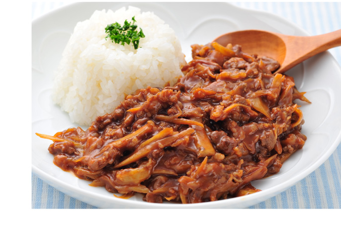 - (3)(1)をほぐしながら加えて、炒め合わせ、肉の色が変わったら、小麦粉をまんべんなく振り入れて、粉っぽさがなくなるまで炒める。