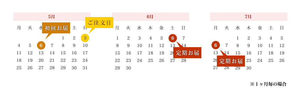 (例)5月3日にご注文⇒初回お届け:5月6日 定期2回目お届け日:第2回目お届け6月6日(※1ヶ月毎の場合)